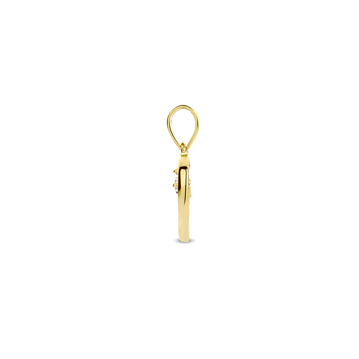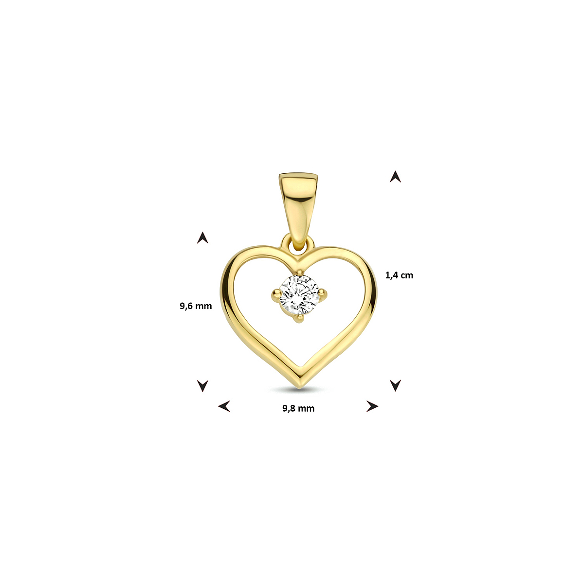 9k Geelkleurige hanger uitgevoerd in de vorm van een hartje met daarin een heldere zirkonia. De hanger heeft een hoogte van 9.5mm excl. oogje.