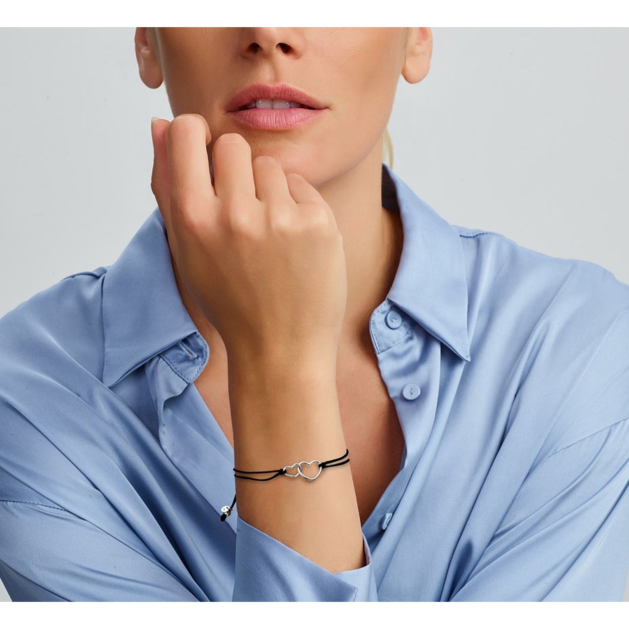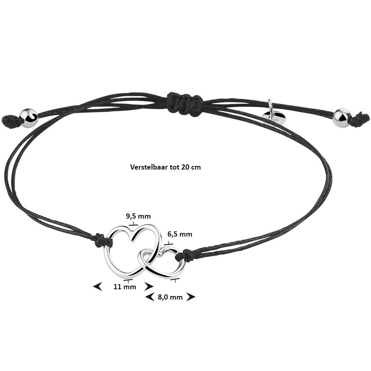Zwart gevlochten armband uitgevoerd met twee 925 zilveren hartjes. De armband heeft een verstelbare draaglengte tot 20cm. De hartjes hebben een afmeting van 6.5x8 en 9.5x11mm.