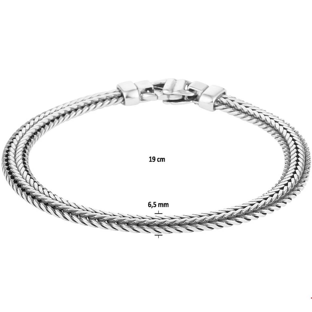 Beschrijving: Stijlvolle geoxideerd zilveren armband met een vossestaart schakel. De armband heeft een draaglengte van 19cm en een schakelbreedte van 6.5mm. Uitgevoerd met een stevige karabijn sluiting.