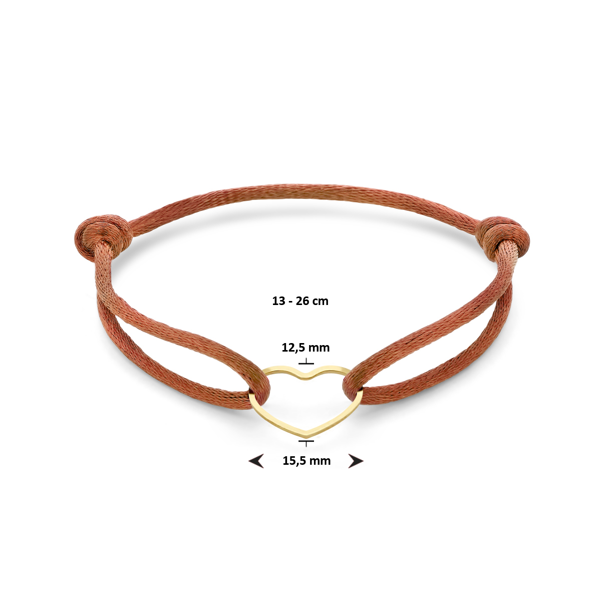 Brandy roest gevlochten armband uitgevoerd met verguld op 925 zilveren hartje. De armband heeft draaglengtes van 13 tot 26cm en het hartje heeft een afmeting van 12.5x15.5mm. Geen garantie op plating.
