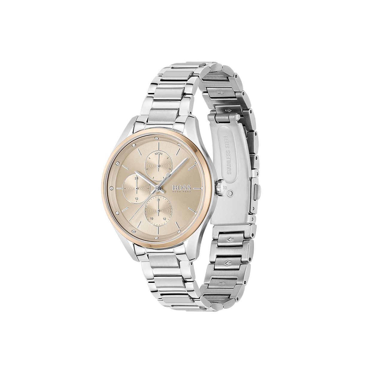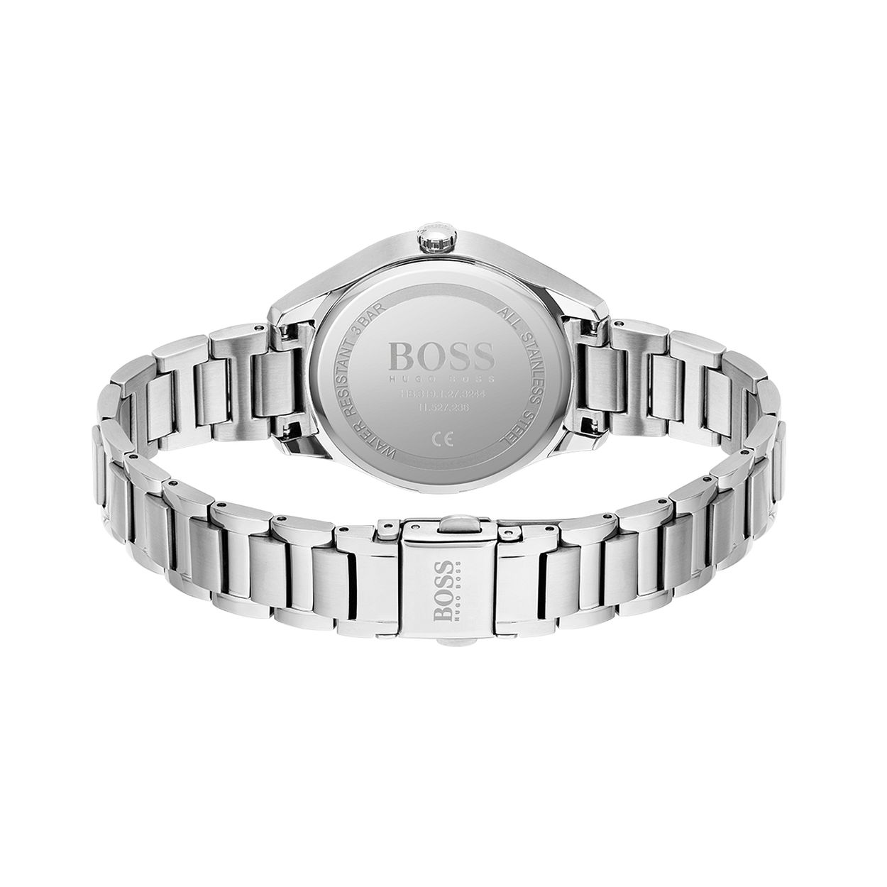 Dit BOSS dameshorloge uit de Grand Course serie met artikelnr. HB1502604 is een lux en stijlvol horloge voor de BOSS dame. Het horloge heeft een zilverkleurige stalen horlogekast met een lichte ros�kleurige wijzerplaat met dag, datum en 24-uursaanduiding. Het stijlvolle dameshorloge heeft als opvallend kenmerk de kristallen steentjes die samen met de verfijnde zilverkleurige lijntjes op de wijzerplaat de uren weergeeft. De horlogeband is een fijne zilverkleurige schakelband met vouwsluiting. Het BOSS Grand Course dameshorloge heeft een doorsnee van 36mm, een mineraalglas en is 3 ATM.