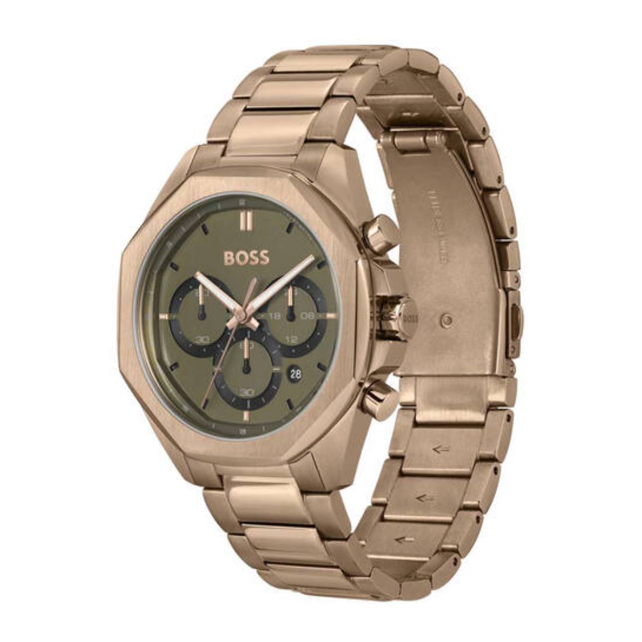 Dit BOSS horloge uit de Cloud serie met artikelnr: HB1514019 heeft een casual uitstraling. Het herenhorloge valt op door zijn beigekleurige stalen horlogekast met een matte bezel en een groene wijzerplaat met chronograaf en datumaanduiding. De lumibrite wijzers vallen goed op en geven het horloge een sportief uiterlijk. Aan de kast zit een beigekleurige stalen schakel band met een vouwsluiting. De kast van het horloge heeft een doorsnee van 44mm met mineraalglas en is 5 ATM.