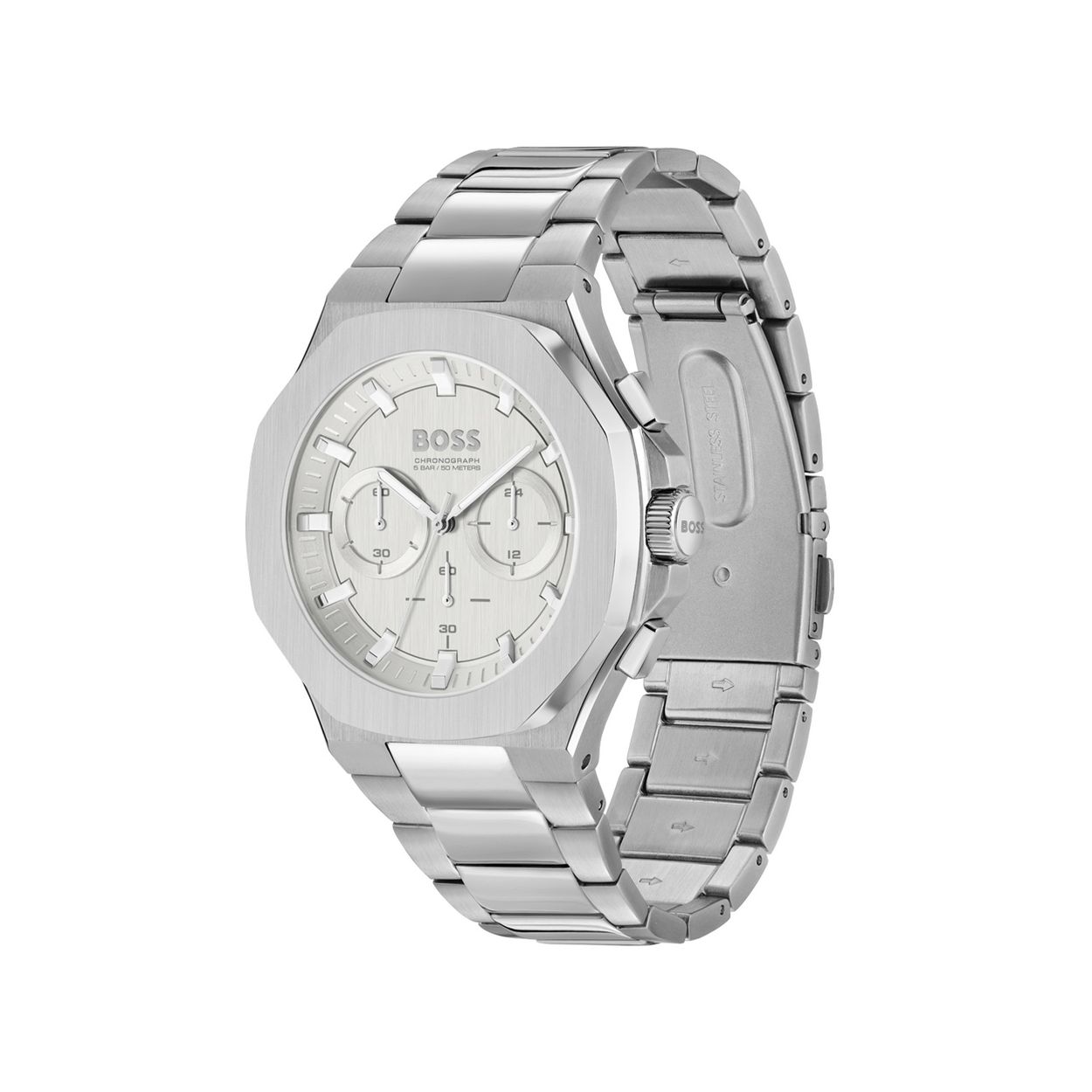 Dit BOSS horloge uit de TAPER serie met artikelnr: HB1514087 heeft een luxe sport uitstraling. Zeer geschikt voor de moderne stijlvolle man van nu. Het herenhorloge valt op door zijn zilverkleurige stalen horlogekast met een 8-hoekige bezel en een zilverkleurige wijzerplaat met chronograaf. De fijne wijzers en de fijne uursaanduiding geven dit horloge een chique uitstraling. Het horloge heeft lumibrite op de uurwijzers. Aan de kast zit een zilverkleurige stalen schakelband met een vouwsluiting. De kast van het horloge heeft een doorsnee van 45mm met mineraalglas en is 5ATM.