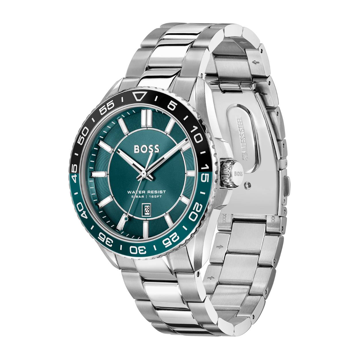 Dit BOSS horloge uit de RUNNER 3H serie met artikelnr: HB1514208 heeft een stoere sportieve uitstraling. Zeer geschikt voor de moderne stijlvolle man van nu. Het herenhorloge valt op door zijn stalen horlogekast met een gekleurde bedrukte bezel en een groenblauwe sunray wijzerplaat met een datum. Opvallend zijn de wijzers en uurstrepen die met lumibrite zijn ingelegd. Aan de kast zit een stalen mat glanzende schakelband met een vouwsluiting. Het horloge heeft een doorsnee van 43mm met een mineraalglas en is 5ATM.