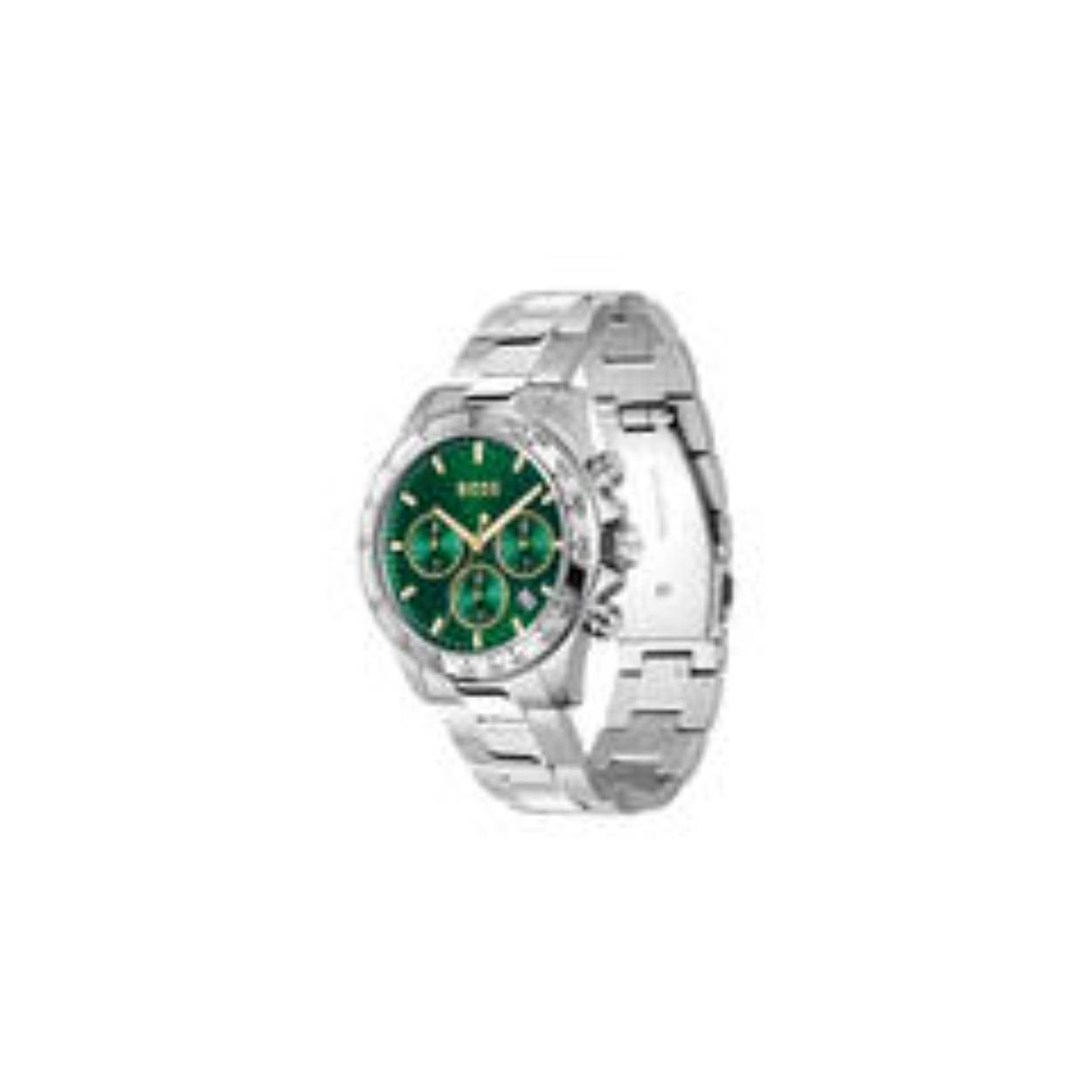 Dit BOSS horloge uit de HERO serie met artikelnr: HB1514217 heeft een stoere sportieve uitstraling. Zeer geschikt voor de moderne stijlvolle man van nu. Het herenhorloge valt op door zijn stalen horlogekast met een bedrukte bezel en een groene sunray wijzerplaat met BOSS logo, chronograaf en een datum. Opvallend zijn de wijzers die met lumibrite zijn ingelegd. Aan de kast zit een stalen mat glanzende schakelband met een vouwsluiting. Het horloge heeft een doorsnee van 43mm met een mineraalglas en is 5ATM.