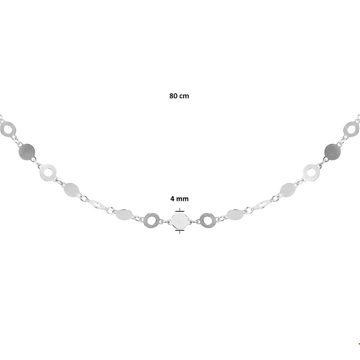 Beschrijving: Dit trendy gerhodineerd zilveren collier heeft een draaglengte van 80cm en een stevige karabijn sluiting. Het collier is uitgevoerd met open en gesloten rondjes van 4mm. Info: Gerhodineerd zilver is door de rhodiumlaag beter bestand tegen verkleuren en krassen.