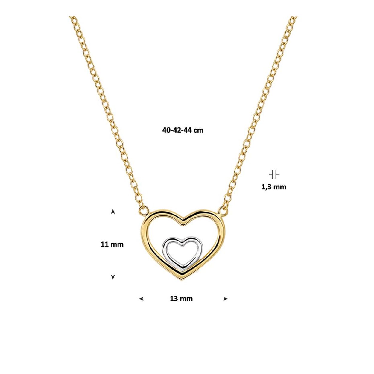 Wit met geelgouden collier met harten. Het collier heeft draaglengtes van 40 42 en 44 cm.