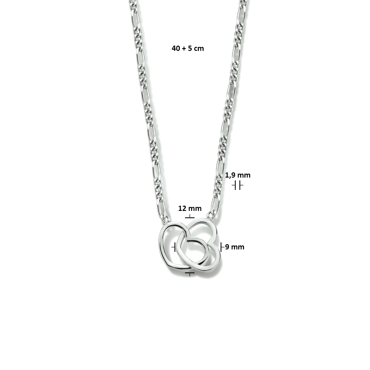 Gerhodineerd 925 zilveren figaro collier uitgevoerd met twee hartjes. Het collier heeft een draaglengte van 40cm met een extensie van 5cm en een stevige karabijn sluiting. De hartjes hebben een afmeting van 9x12mm. De schakelbreedte is 1.9mm.