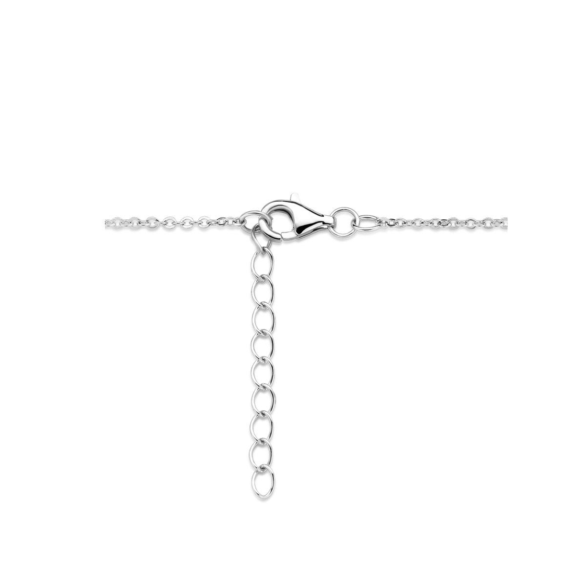 Gerhodineerd 925 zilveren collier uitgevoerd met twee hartjes en zirkonia. Het collier heeft een schakelbreedte van 1.3mm en een draaglengte van 42cm met 3cm extensie.