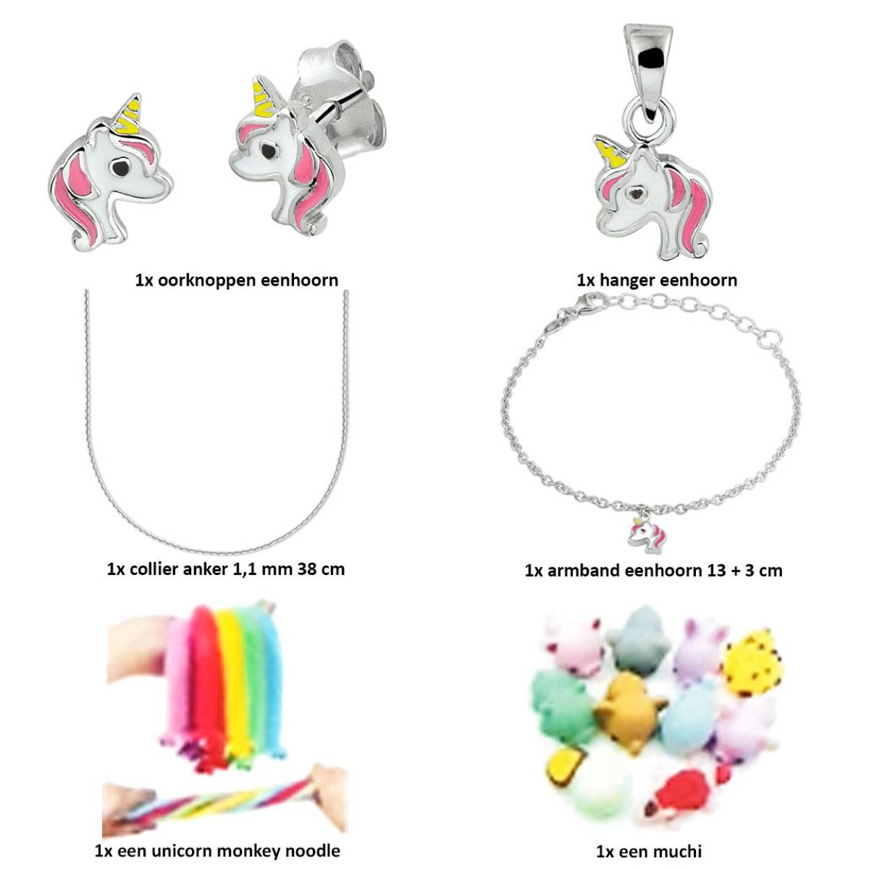 Leuke verrassingsbox voor uw kind! de box is verdeeld in 6 vakjes met leuke cadeaus. Onder andere een collier, hanger, oorbellen en armband met een bedel van een eenhoorn