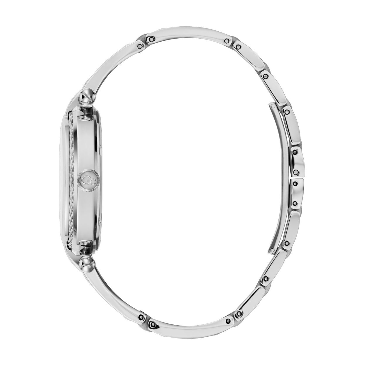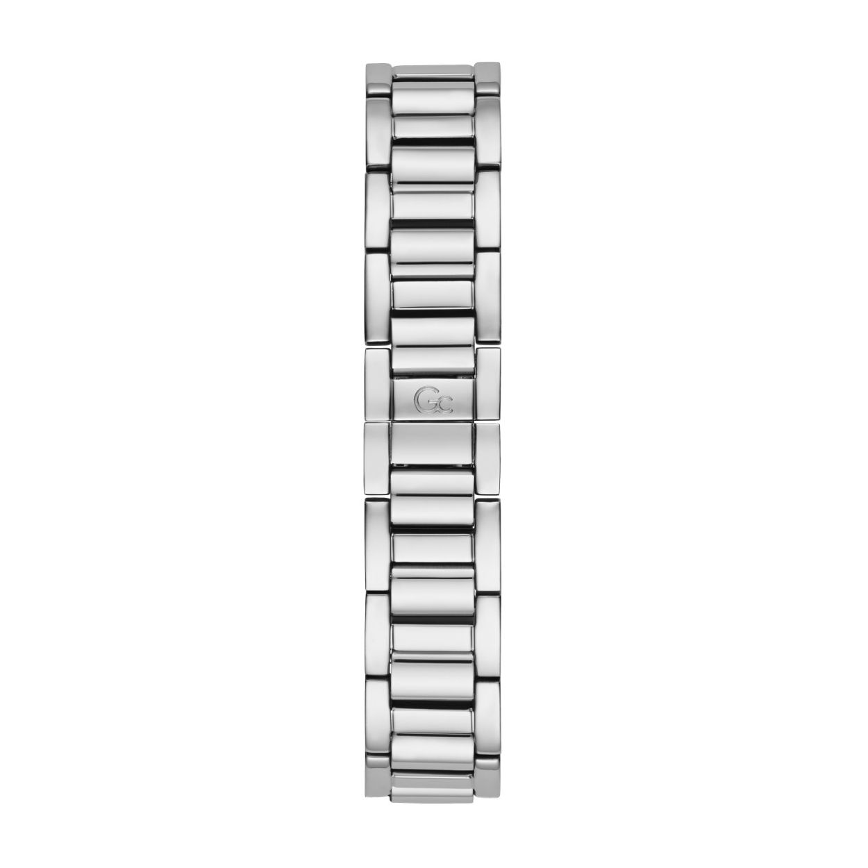 Dit zilverkleurige Gc CableBijou horloge is ��n van de meest elegante maar stoere dameshorloges uit de Gc collectie. De diameter van de kast is 36 mm. De lunet met kabeldetail rondom valt direct op. De elegantie komt naar voren door de donkere parelmoer wijzerplaat met ros�goudkleurige index. De zilverkleurige band met kabeldetails maken dit horloge stoer en modieus. Model: Y56001L7MF.