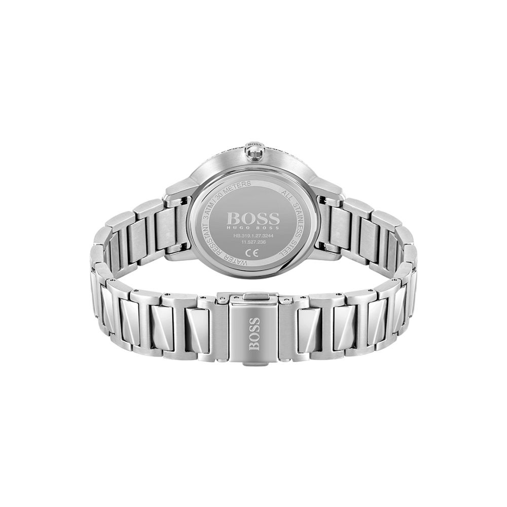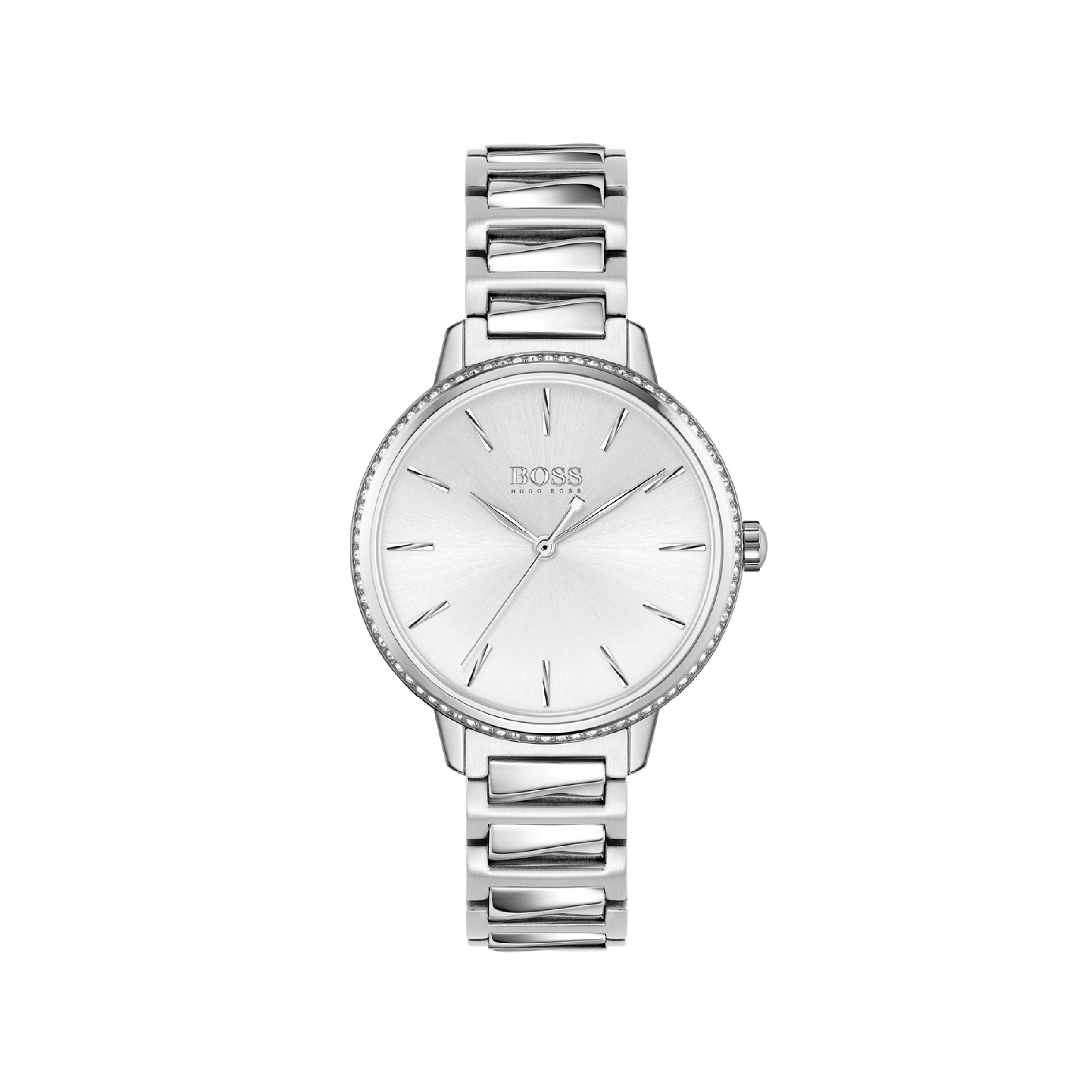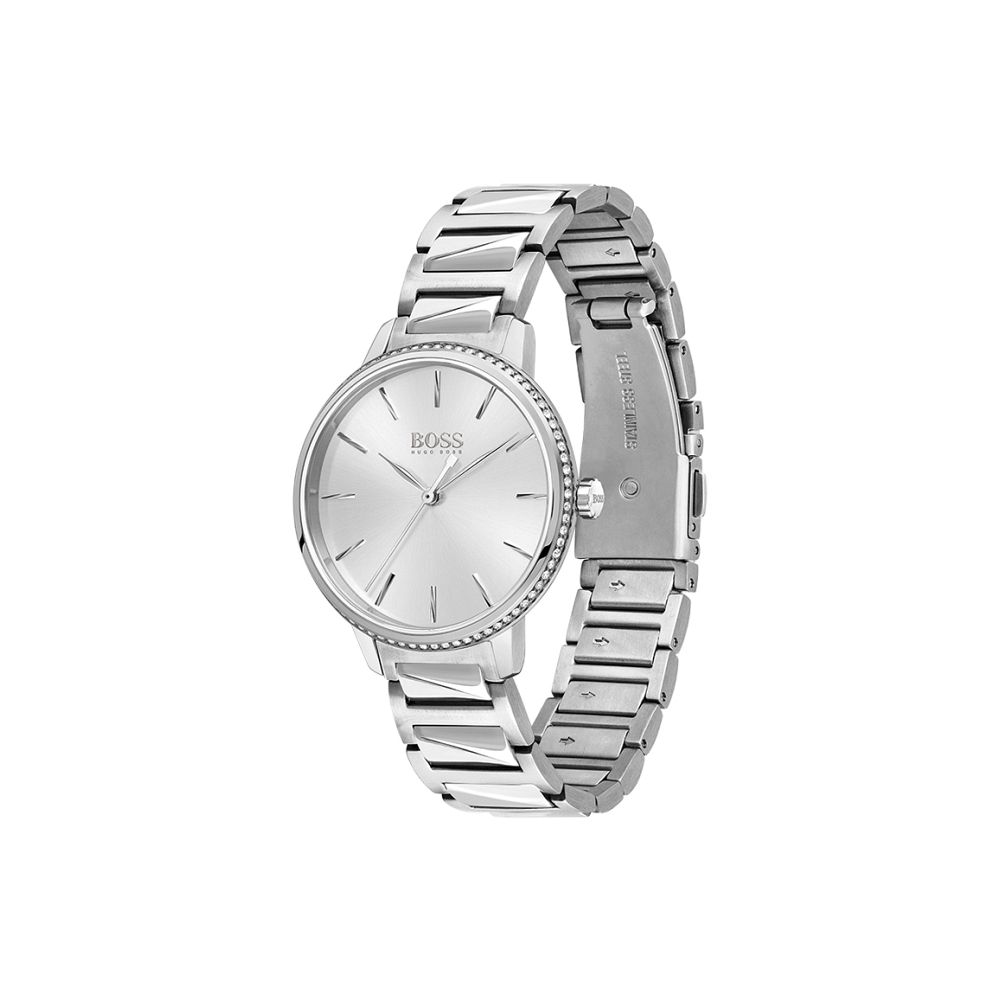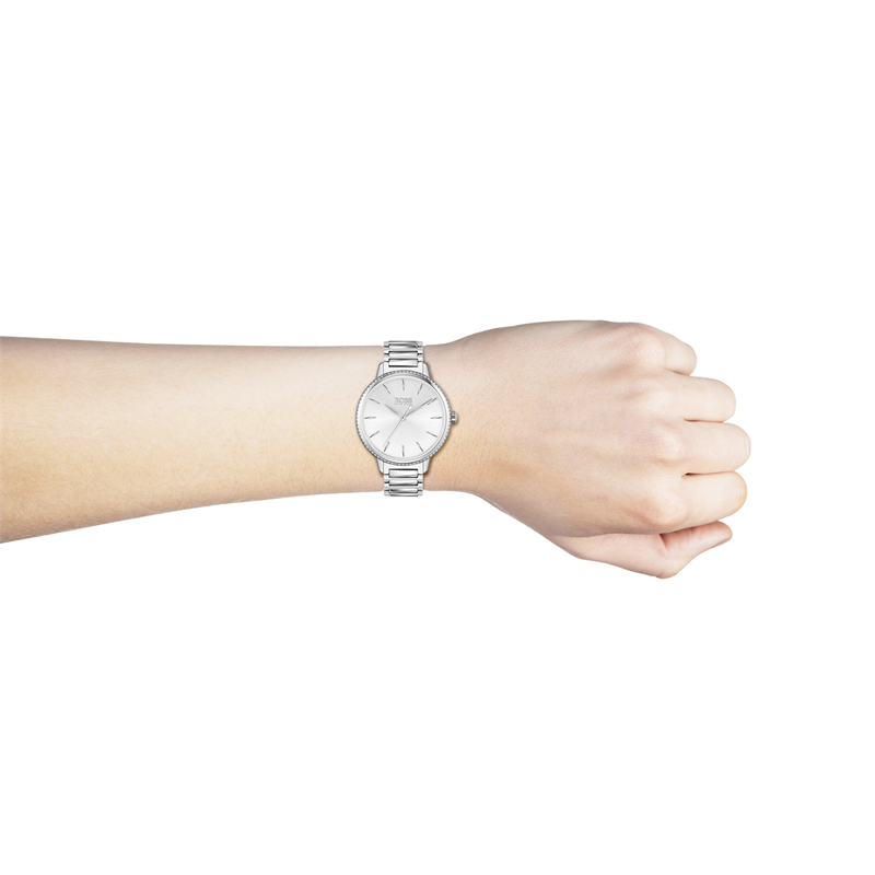 Dit dameshorloge uit de BOSS Signature serie is een casual horloge. Het horloge heeft mineraalglas, een zilverkleurige wijzerplaat met Swarovski kristallen en een stalen horlogekast met een kastdiameter van 34 mm. De band van het horloge is van staal en kan op maat worden gemaakt door er schakels uit te halen.