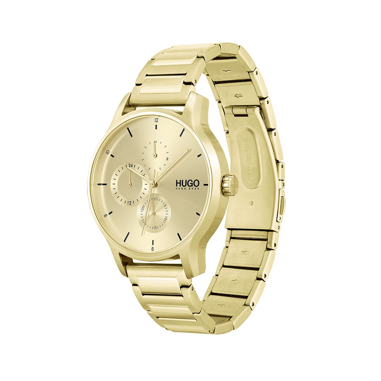 Dit HUGO horloge uit de Bounce serie met artikelnr. HB1530214 is voor de HUGO klant die graag opvalt. Het herenhorloge heeft een goudkleurige stalen horlogekast met een goudkleurige wijzerplaat met dag, datum, en 24-uurs aanduiding. Aan de kast zit een goudkleurige stalen schakelband met vouwsluiting. Het horloge heeft een mineraalglas, een doorsnee van 44mm en is 5 ATM.