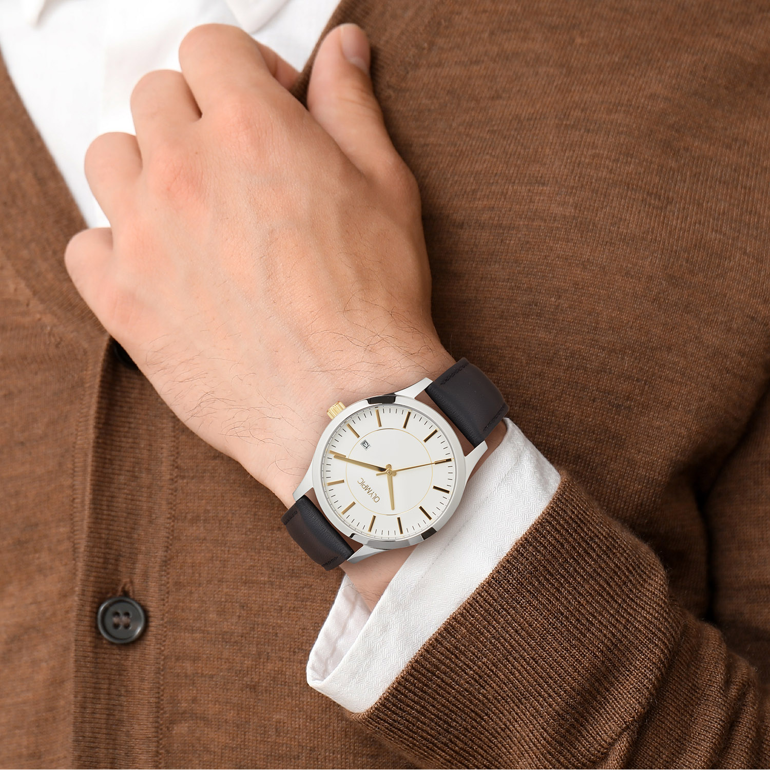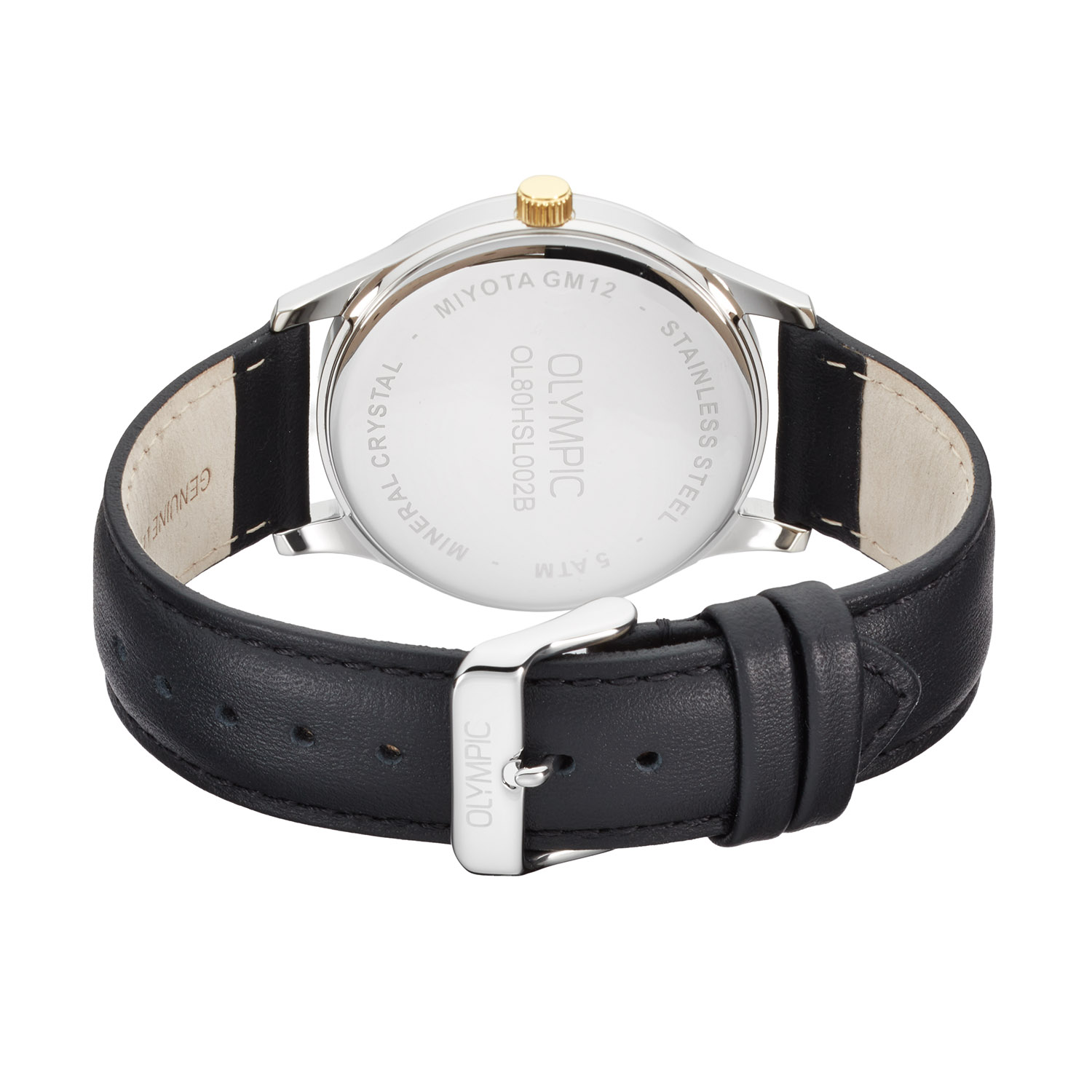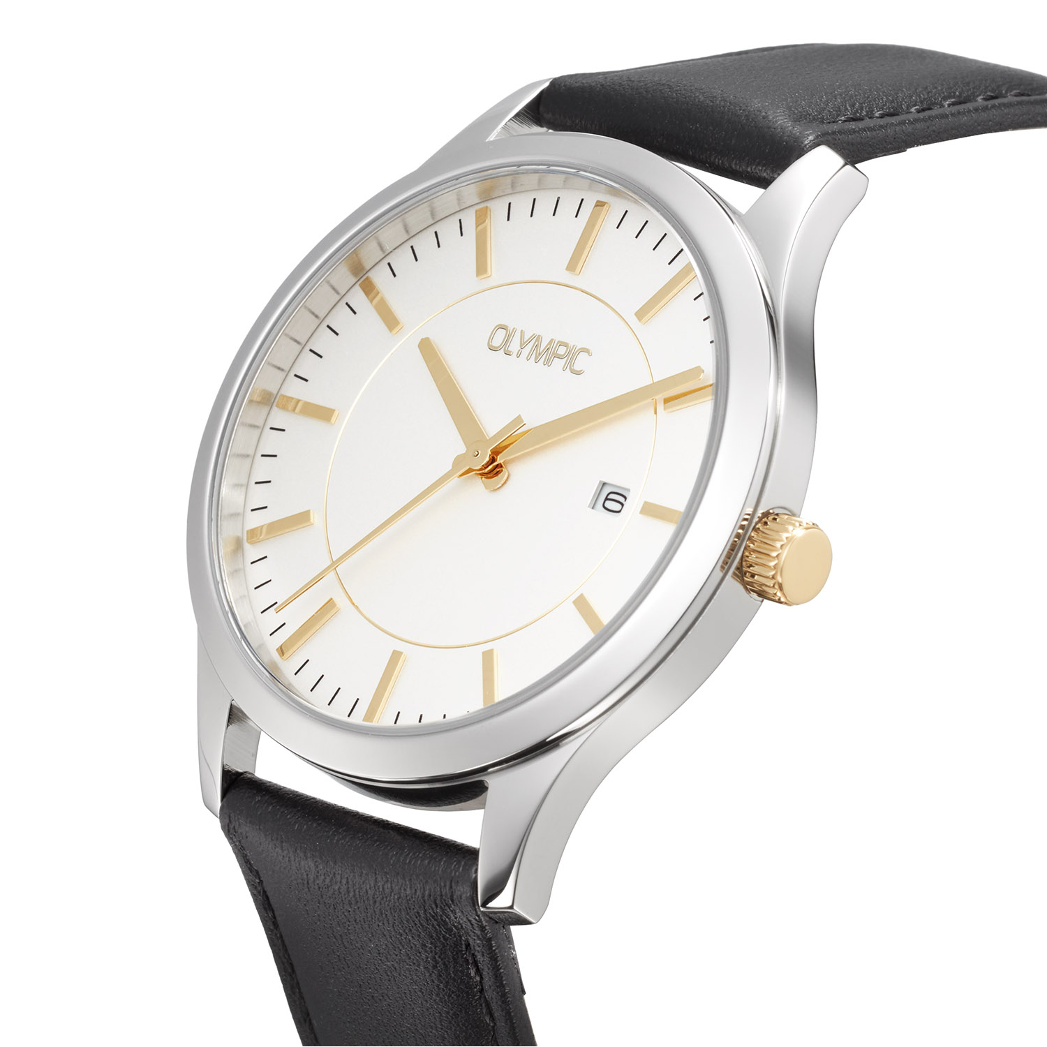 Dit unieke Olympic model met artikelnummer: OL80HSL002B is een klassiek herenhorloge. Het horloge heeft een stalen kast met een gladde bezel en een matte witte wijzerplaat met een datum en fijne uursaanduiding. Aan de kast zit een zwarte lerenband met een gespsluiting. Het horloge heeft een mineraalglas, een doorsnee van 40mm en is 5ATM.