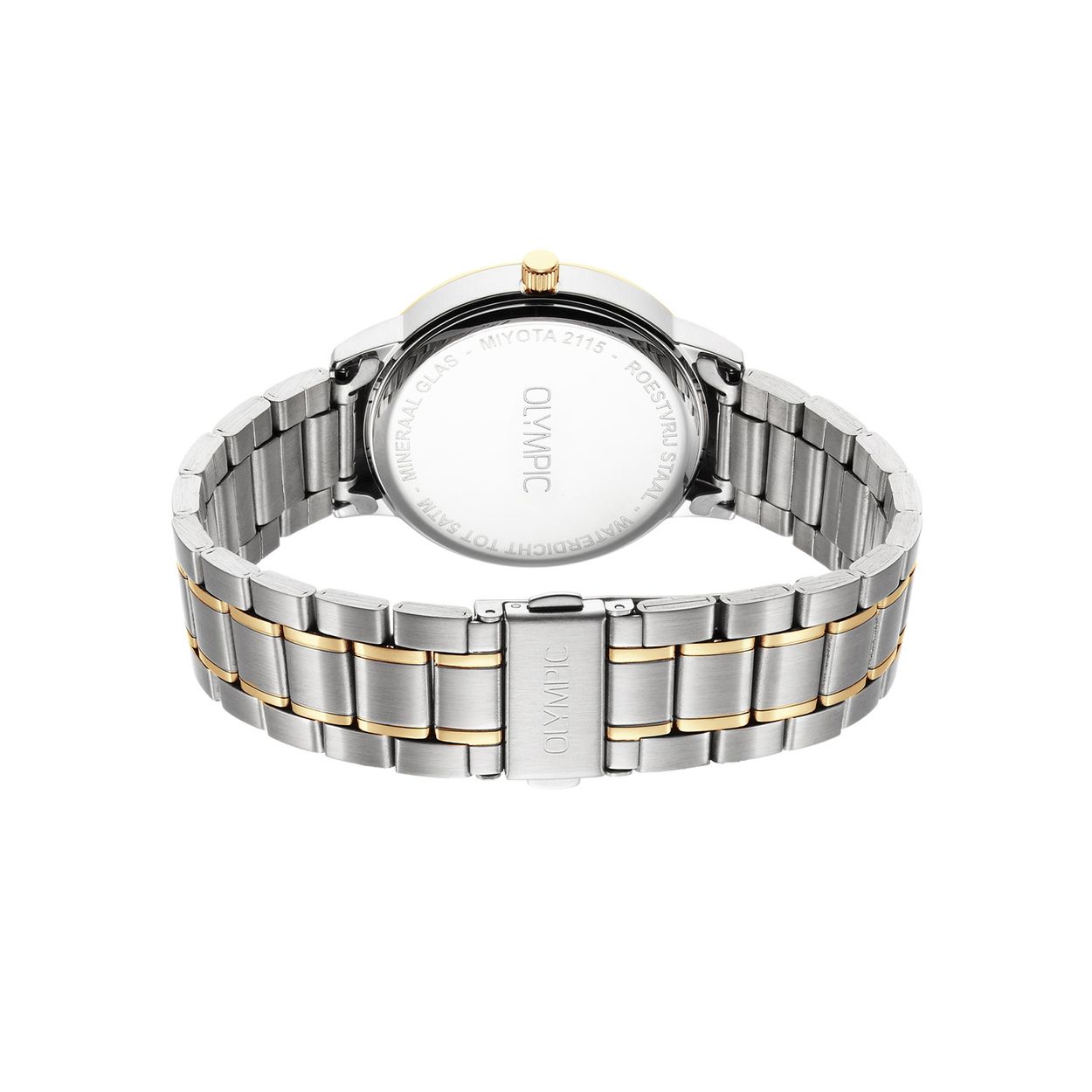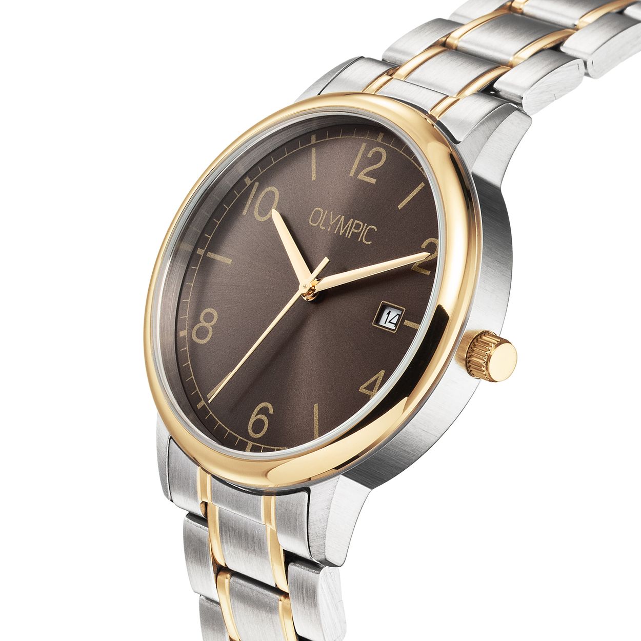 Dit unieke Olympic horloge met artikelnummer: OL80HSS001B is een herenhorloge met een classic sportieve uitstraling. Het horloge heeft een ronde stalen kast met een bruine wijzerplaat, een goudkleurige bezel en een datum. Aan de kast zit een stalen bicolor schakelband met vouwsluiting. Het horloge heeft een mineraalglas, een doorsnee van 37mm en is 5ATM.