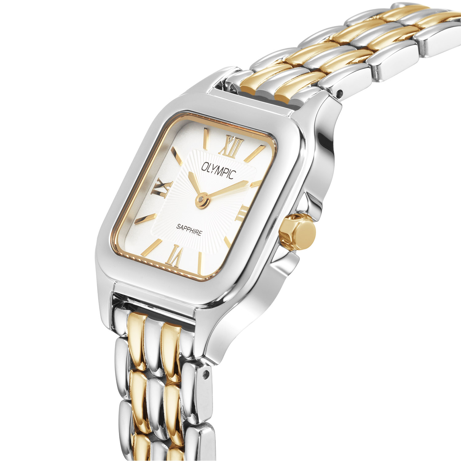 Dit unieke Olympic model met artikelnummer: OL73DSS008B is een chique dameshorloge. Het horloge heeft een stalen vierkante kast met een goudkleurige bezel en een zilverwitte wijzerplaat met strepen en romeinse cijfers. Aan de kast zit een bicolor stalen schakelband met een druksluiting. Het horloge heeft een saffierglas, een doorsnee van 26mm en is 5ATM.