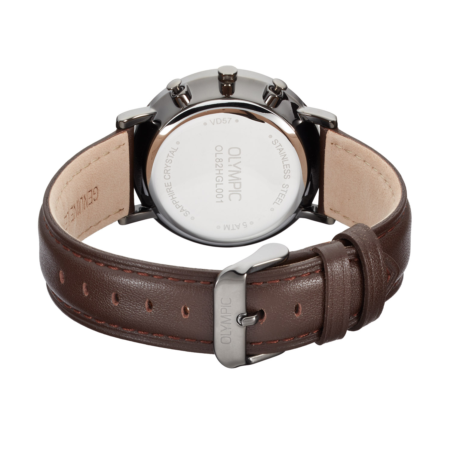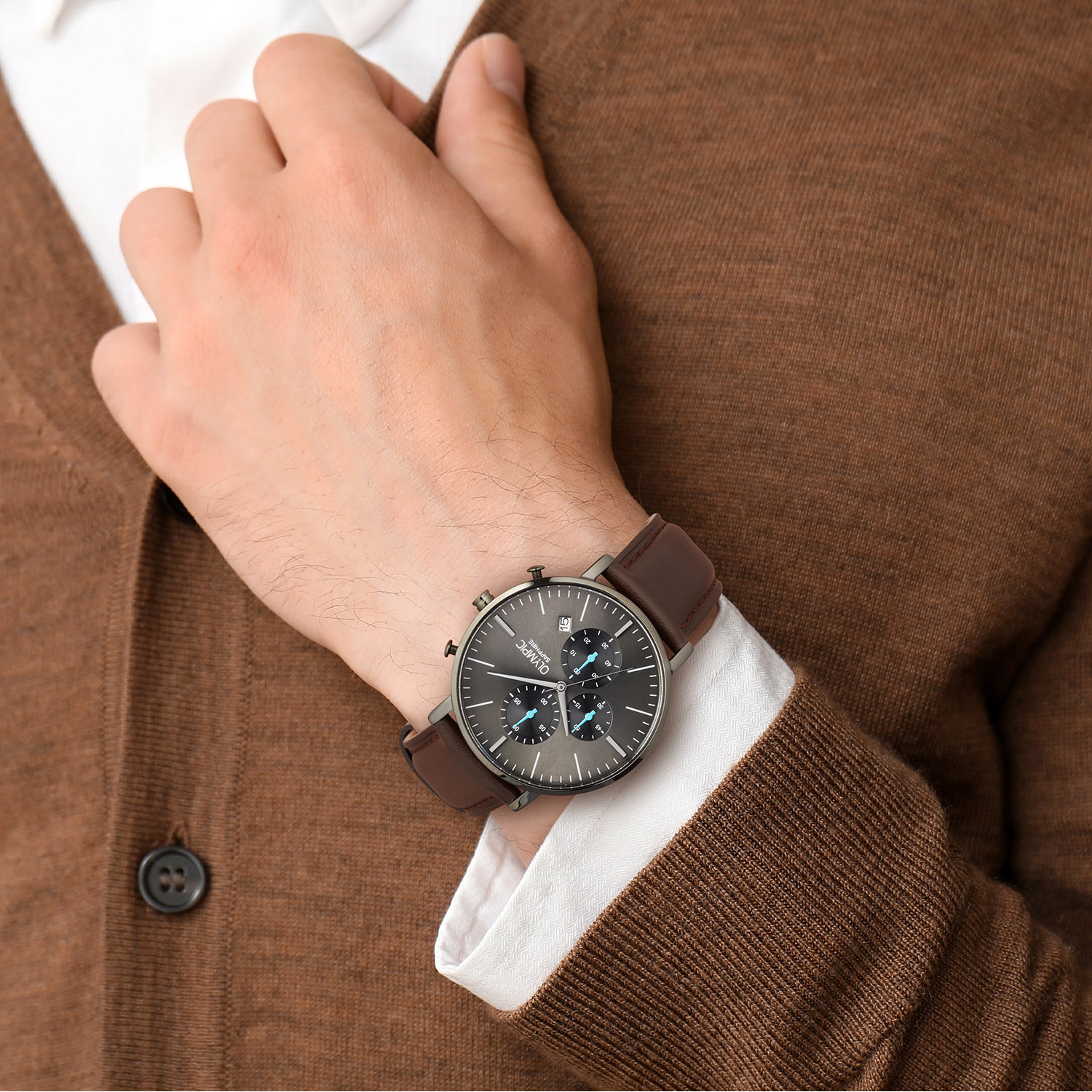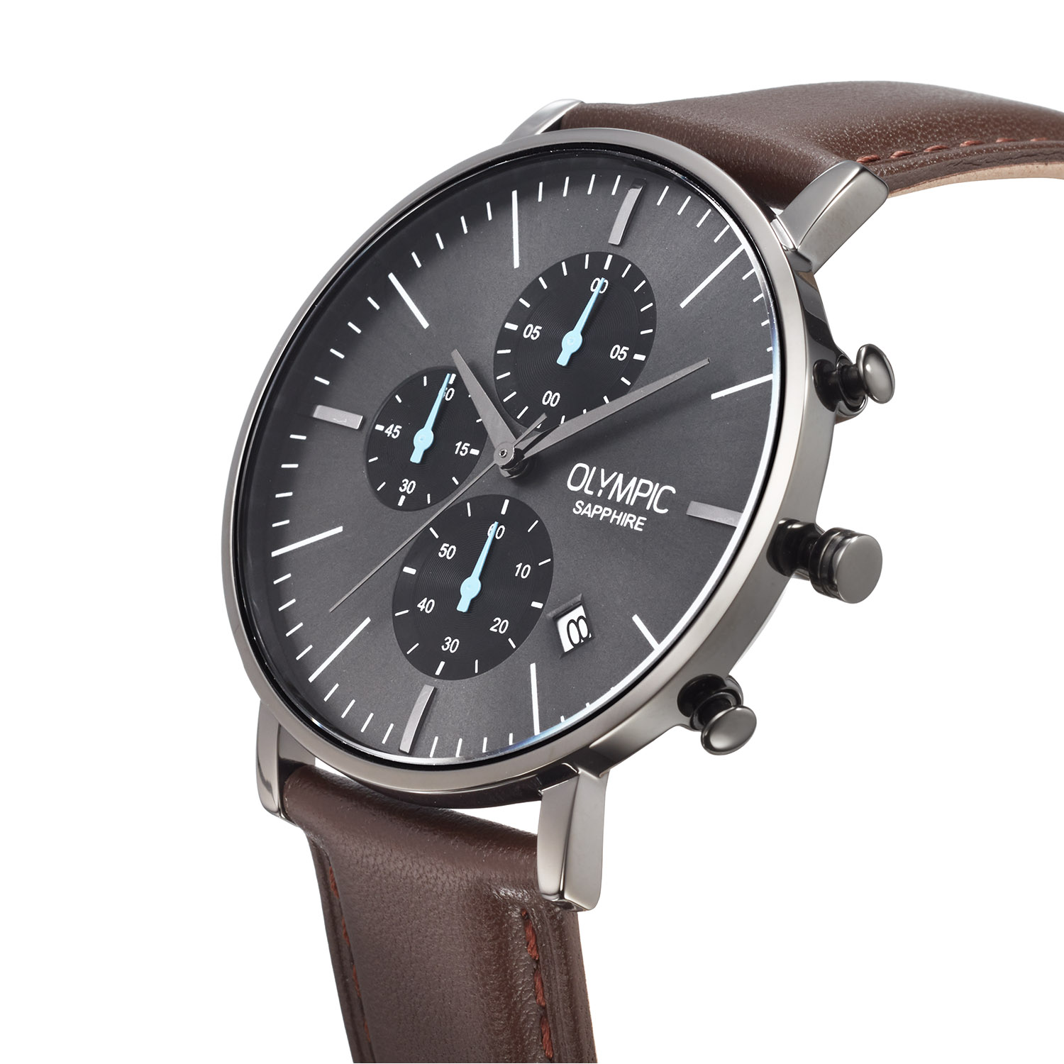 Dit unieke Olympic model met artikelnummer: OL82HGL001 is een chique herenhorloge. Het horloge heeft een gunmetal stalen kast met een grijze sunray wijzerplaat met een datum en een stopwatch met blauwe chronograafmeters. Aan de kast zit een bruine lerenband met een gespsluiting. Het horloge heeft een saffierglas, een doorsnee van 40mm en is 5ATM.