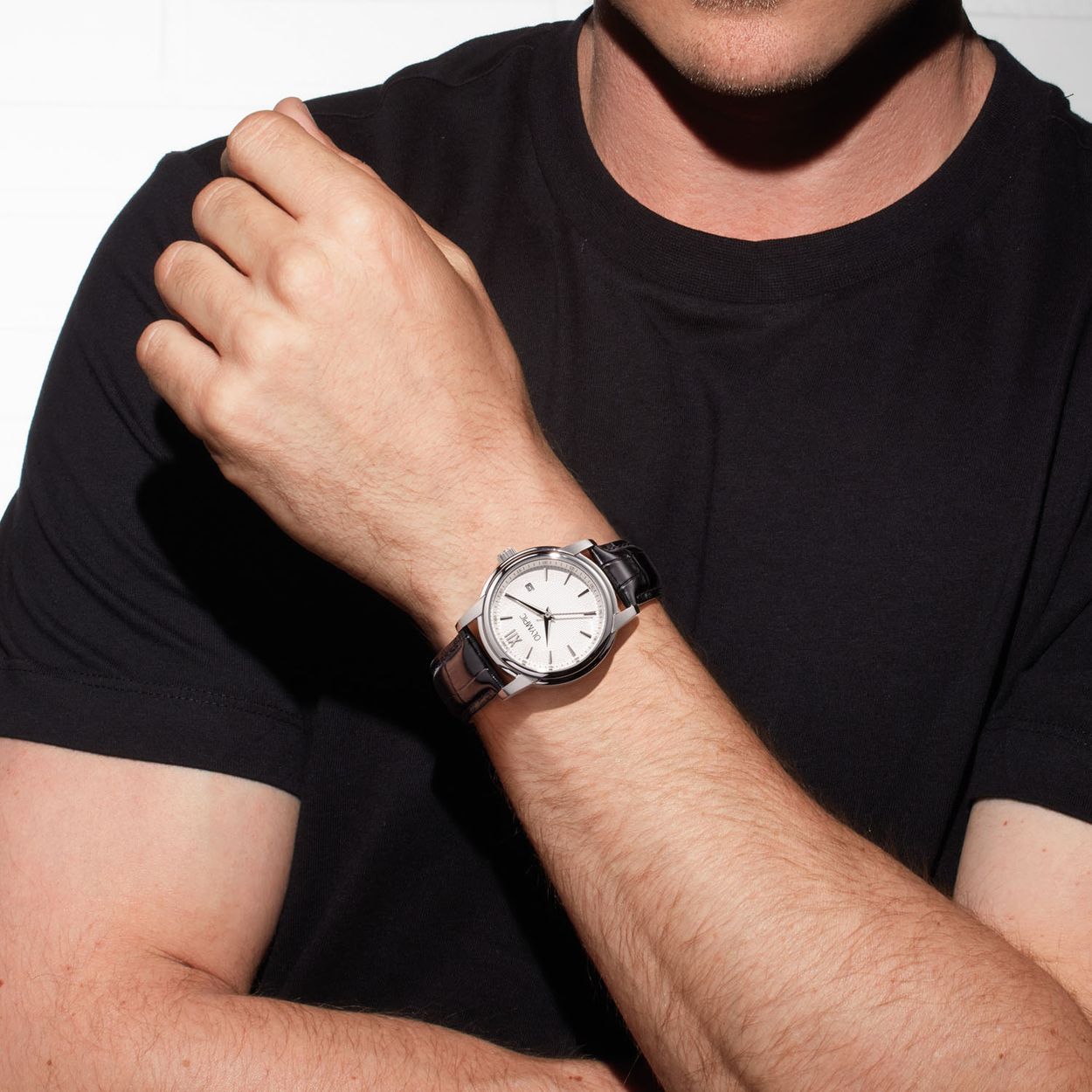 Dit unieke Olympic horloge met artikelnummer: OL89HSL058 is een classic herenhorloge. Het horloge heeft een ronde stalen kast met een crème bewerkte wijzerplaat met streepjes als uursaanduiding en een datum. Aan de kast zit een zwarte krokoprint lerenband met een gespsluiting. Het horloge heeft een mineraalglas, een doorsnee van 39mm en is 5ATM.