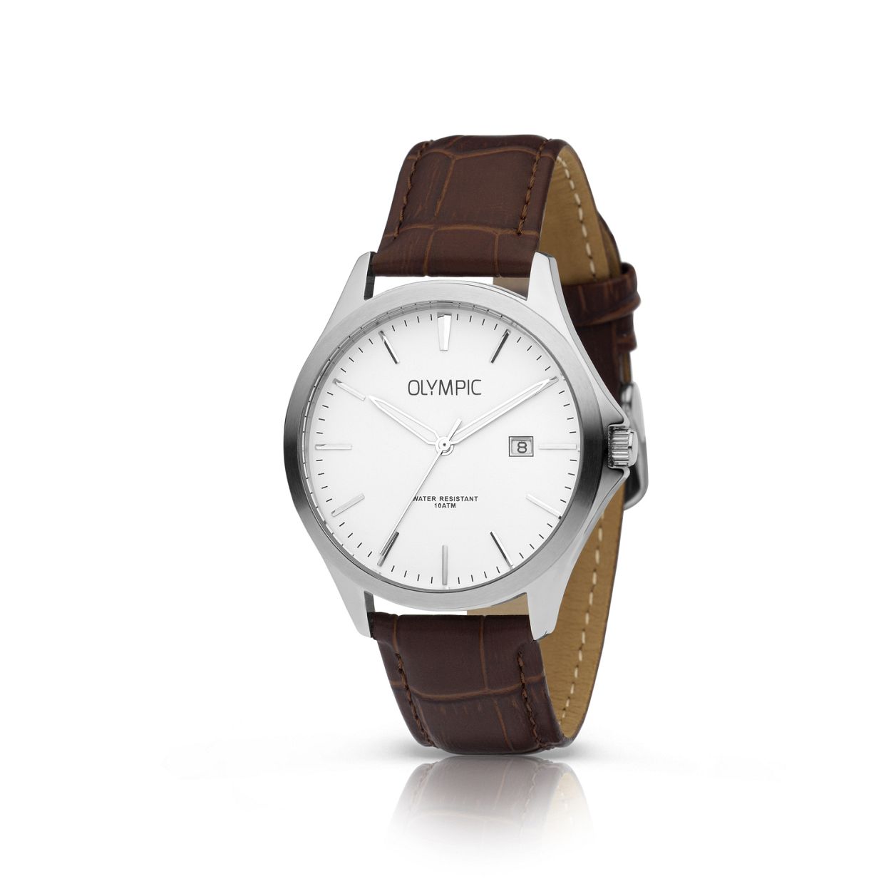Dit unieke Olympic horloge met artikelnummer: OL72HSL067 is een klassiek herenhorloge. De zilverkleurige stalen kast heeft een witte wijzerplaat met opvallende streepjes en een datumaanduiding. Aan het horloge zit een bruine leren band met een gesp. Het horloge heeft een mineraalglas, een afmeting van 40mm en is 10 ATM.