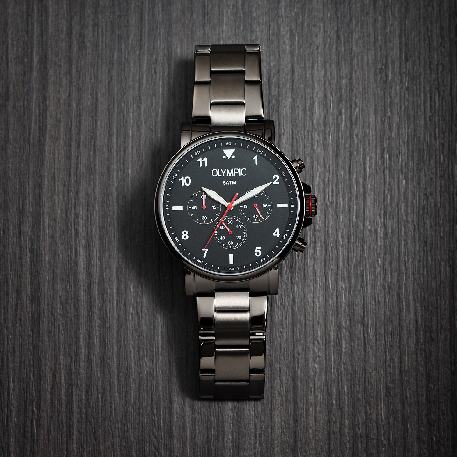 Dit unieke Olympic horloge met artikelnummer: OL89HGG002 is een heren horloge met een stoere uitstraling. De stalen kast heeft een gladde bezel en een grijze wijzerplaat met een chronograaf. De uursaanduiding is opvallend door de lumibrite en rode strepen en wijzers. Dit geeft het horloge een stoer uiterlijk. Aan de stalen kast zit een gunmetal stalen schakelband met een vouwsluiting. Het horloge heeft een mineraalglas, een doorsnee van 44mm en is 5ATM.