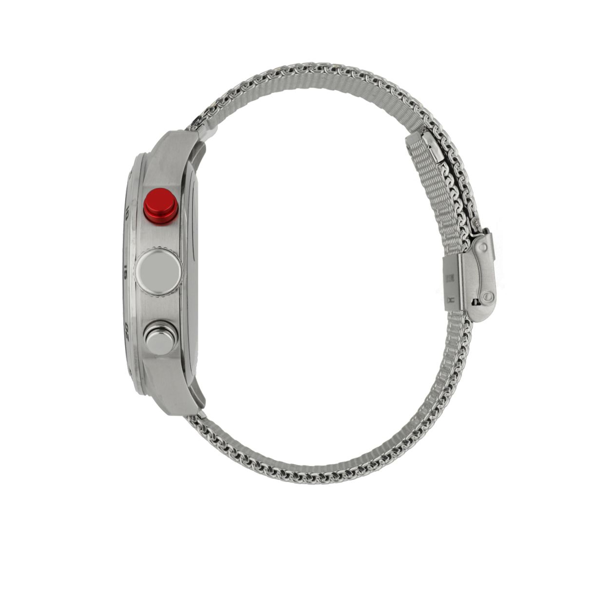 De robuuste kast is gemaakt van geborsteld edelstaal, is 5 atmosfeer waterdicht en heeft een diameter van 44 mm. Kleine kleur details en oplichtende wijzers benadrukken het sportieve karakter van dit schitterende mannen horloge.