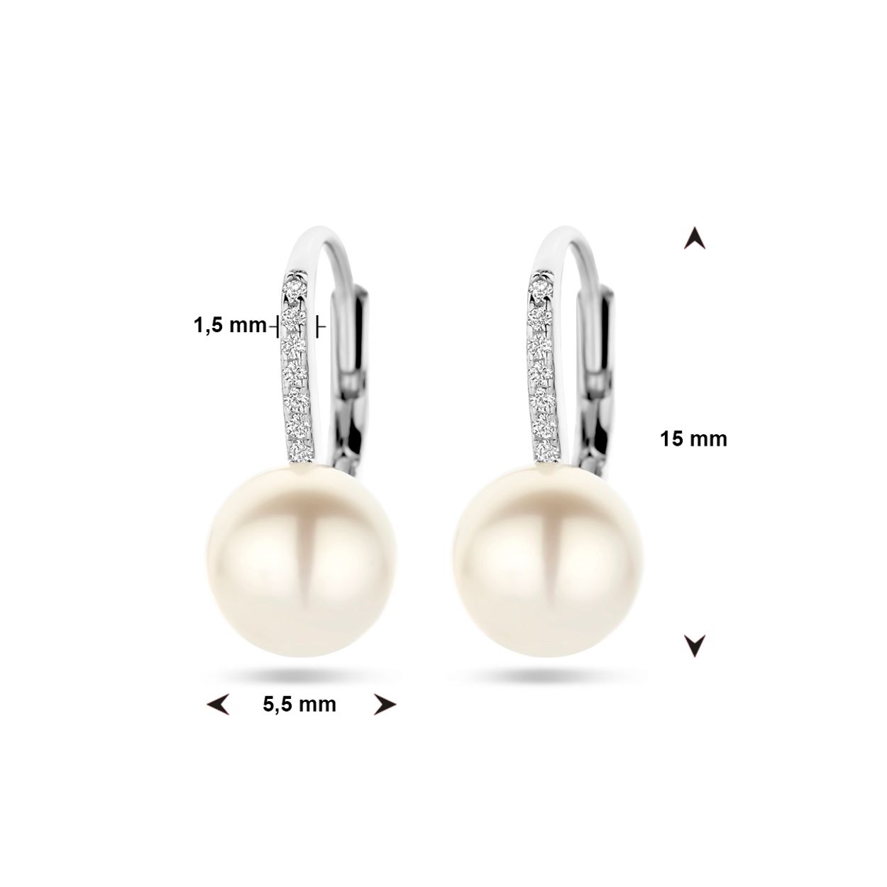 Gerhodineerd 925 zilveren oorhangers uitgevoerd met een zirkonia rij en een zoetwaterparel. De oorhangers hebben een totale hoogte van 15mm.