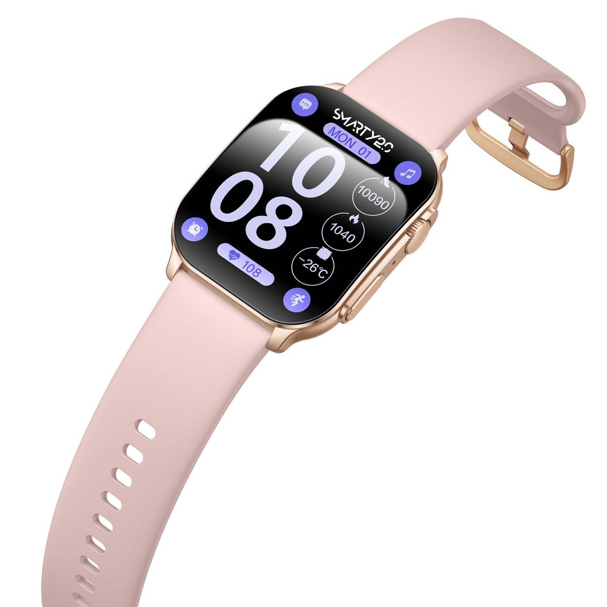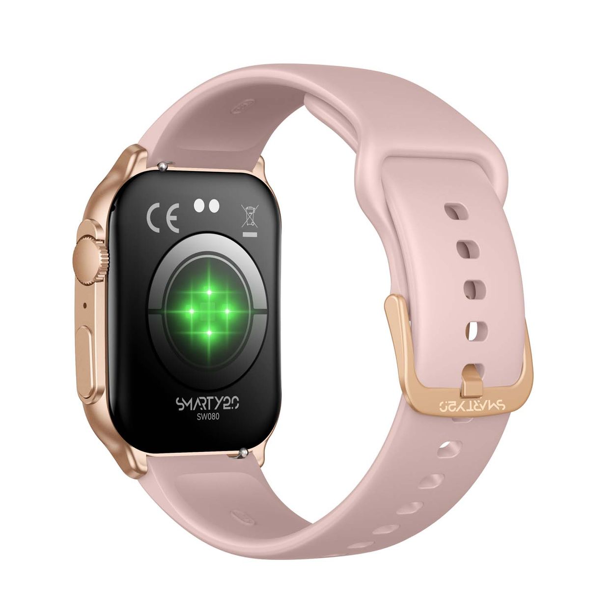 Dit Smarty Smartwatch horloge met nr: SW080B is een stap in de toekomst. De rosékleurige kast is gemaakt van metaal met een gehard glas. Aan de kast zit een roze siliconen band met een gespsluiting. Het rechthoekige horloge heeft een afmeting van 46x37mm en is spatwaterdicht. Bij deze uitvoering krijg je een zwarte siliconen band kado. Deze smartwatch is sportief, stijlvol, maar zeker gebruiksvriendelijk. Om door apps, berichten en tekst te bladeren hoeft je alleen maar op het glas te tikken of de knop te gebruiken.
