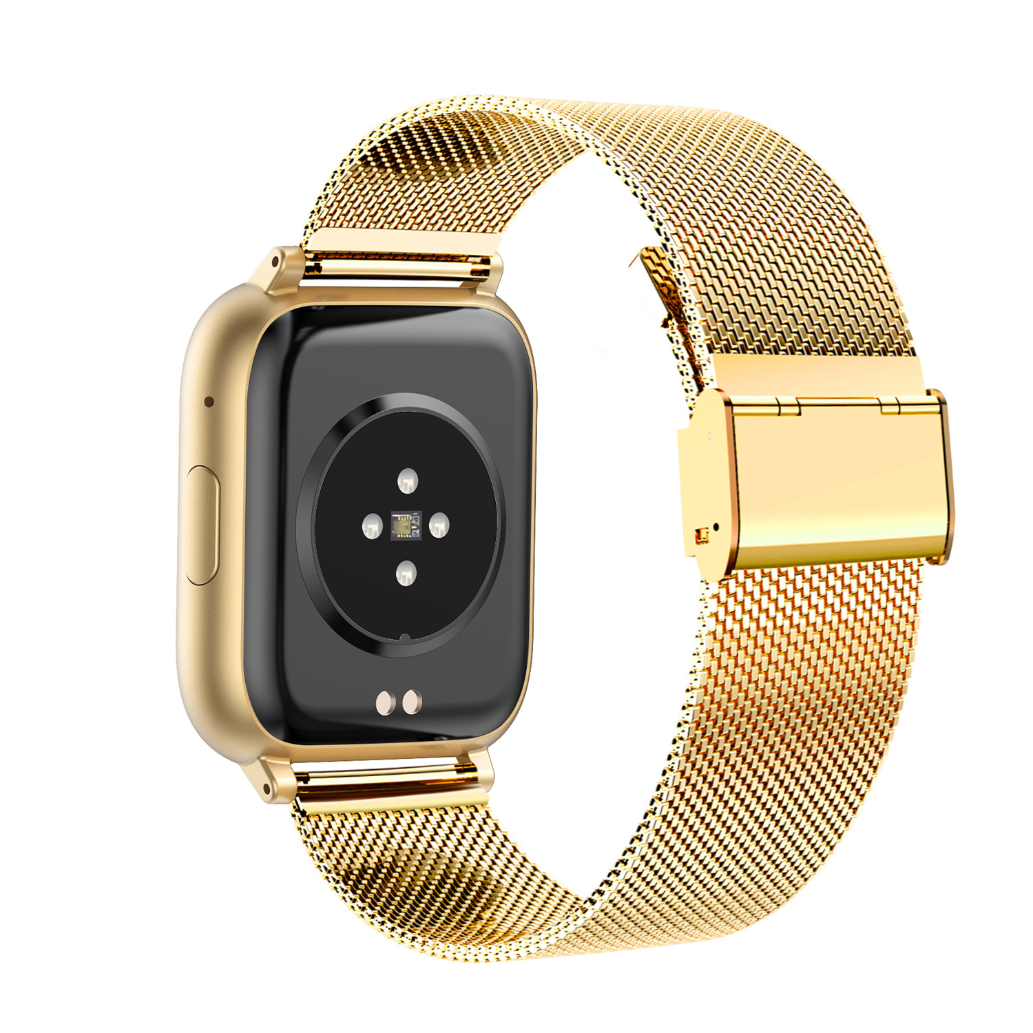 Dit Smarty Smartwatch horloge is een stap in de toekomst. Door zijn Amoled scherm is het beeld vele malen scherper en intenser. De goudkleurige kast is gemaakt van aluminium met een gehard glas. Aan de kast zit een goudkleurige mesh band met een druksluiting. Het rechthoekige horloge heeft een afmeting van 42x36x10mm en is spatwaterdicht. Deze smartwatch is sportief, stijlvol, maar zeker gebruiksvriendelijk. Om door apps, berichten en tekst te bladeren hoeft je alleen maar op het glas te tikken of de knop te gebruiken. Tevens heeft het een Find my watch functie.