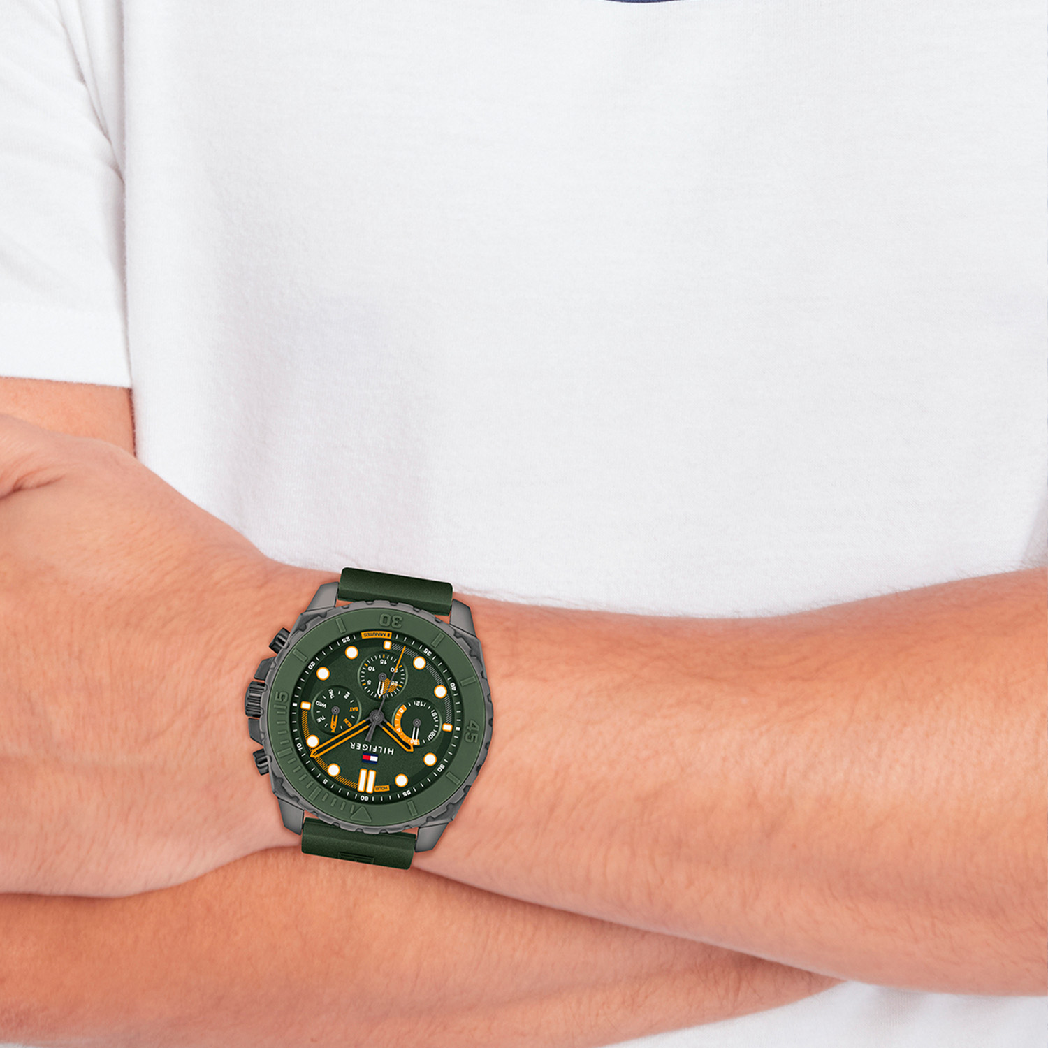 Dit specifieke horloge van Tommy Hilfiger uit de Morgan serie met artikelnr: TH1710688 is een stoer herenhorloge die niet in je collectie mag ontbreken. Het herenhorloge heeft een ronde gunmetal stalen kast met een legergroene siliconen bezel en een legergroene wijzerplaat met een dag, datum en 24-uursaanduiding en oranje accenten. Aan de kast zit een legergroene siliconen band met een gespsluiting. Het horloge heeft een mineraalglas, een afmeting van 48mm en is 5ATM.