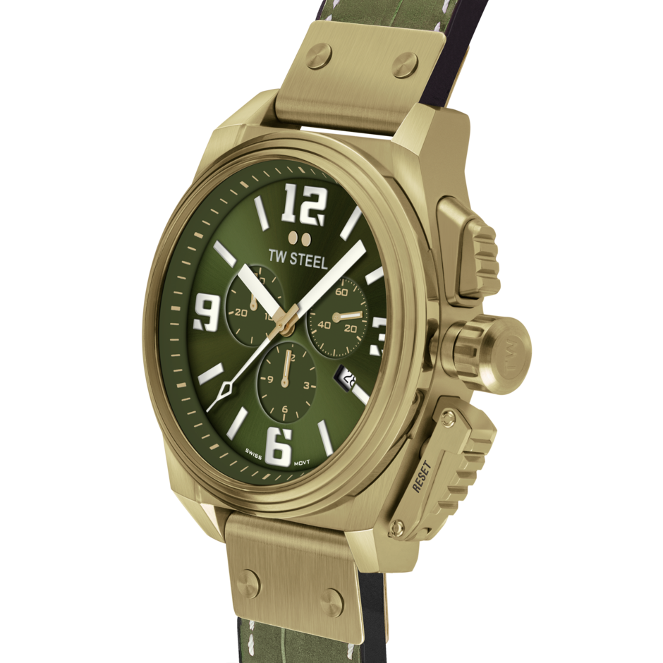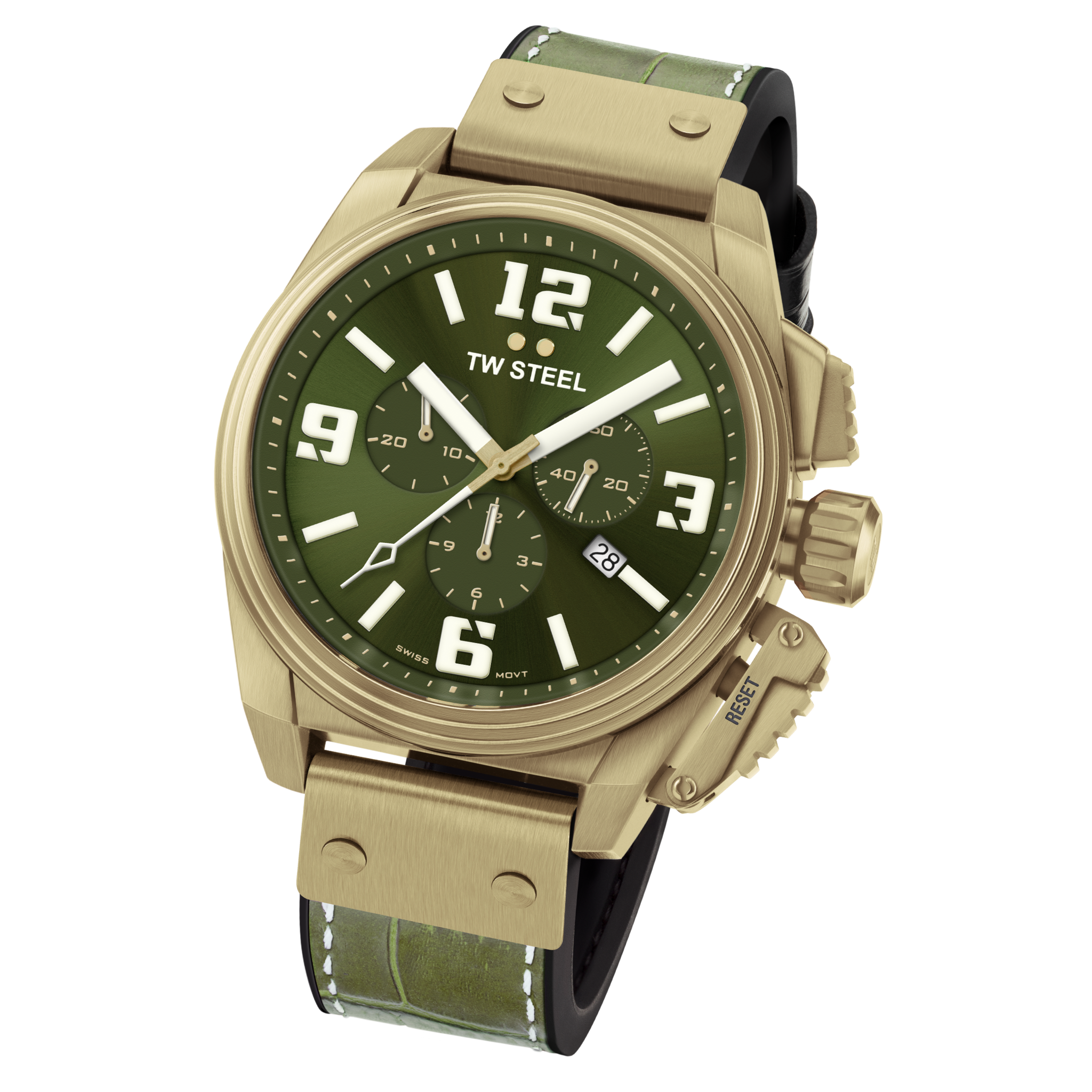 Terug van weggeweest de De TW Steel canteen. Een zwitserse chronograaf en saffier glas een olijfgroene croco band en een brons gouden kast. 3 jaar garantie