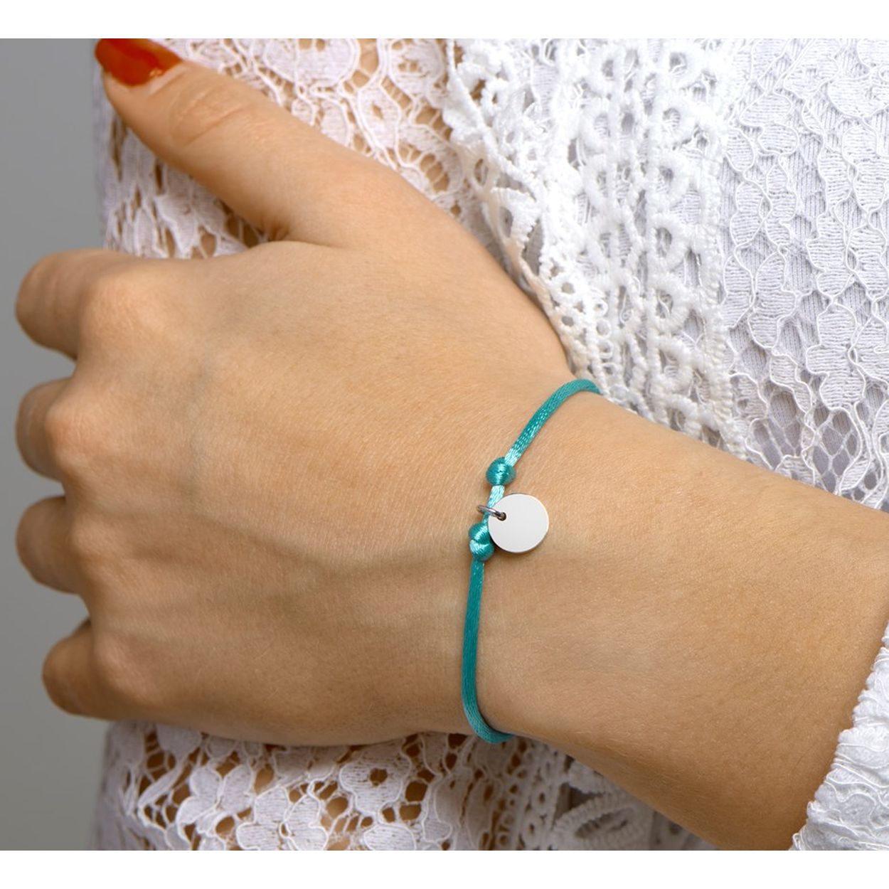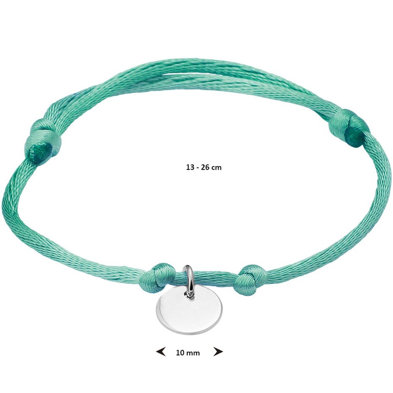 Mint kleur gevlochten armband uitgevoerd met een gerhodineerd 925 zilveren rondje. De armband heeft draaglengtes van 13 tot 26cm. Het rondje heeft een diameter van 10mm.