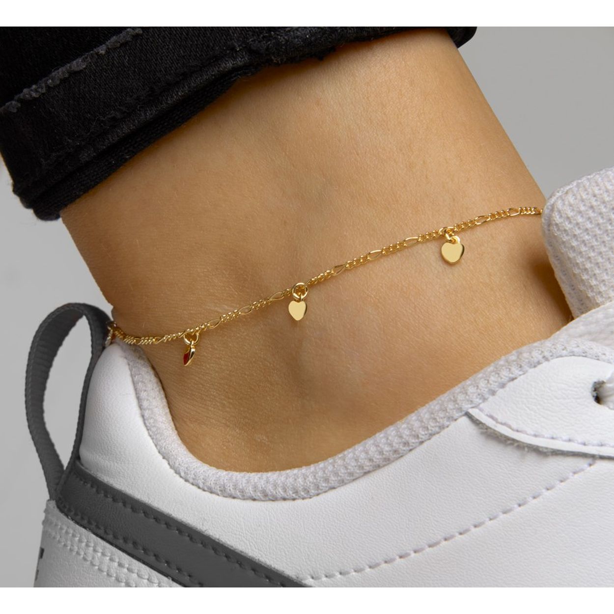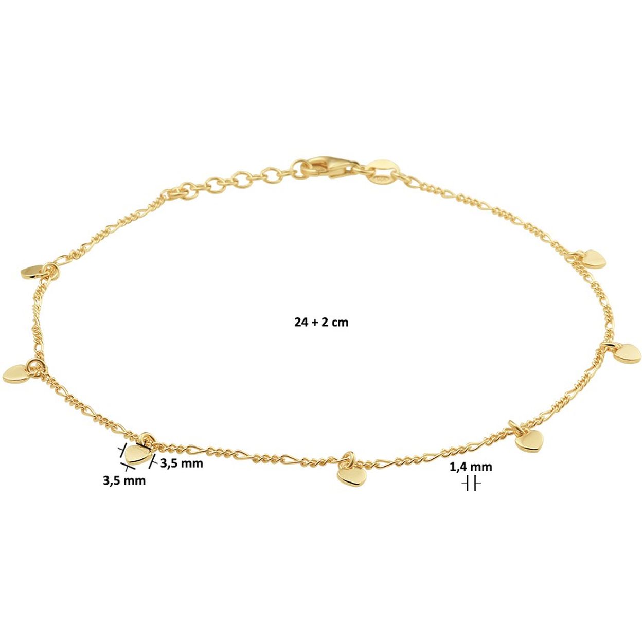 Geelgoud op 925 zilveren enkelbandje uitgevoerd met hartjes en een stevige karabijn sluiting. Het enkelbandje heeft een draaglengte van 24cm met een extensie van 2cm. De hartjes hebben een afmeting van 3.5x3.5mm.