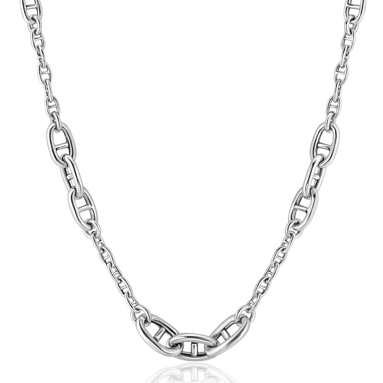 ZINZI zilveren marine schakel ketting, gecombineerd met trendy grotere marine schakels. De grote schakels zijn 7mm breed. De lengte van de ketting is te variëren tussen 43cm en 48cm. Bij sluiting herkenbaar ZINZI, door het zilveren Zinzi hartje. Vervaardigd van eerste gehalte zilver (925) en voorzien van een extra rodiumlaag voor een langdurige glans.